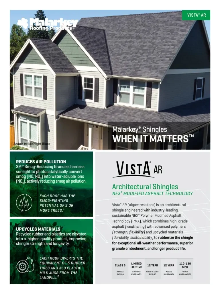 Vista® shingles are best in their class – made with the industry’s leading technology (NEX® Rubberized Asphalt), highest impact rating (Class 4), strongest sustainability (upcycled rubber and plastic, smog-reducing granules), and superior warranty protection.